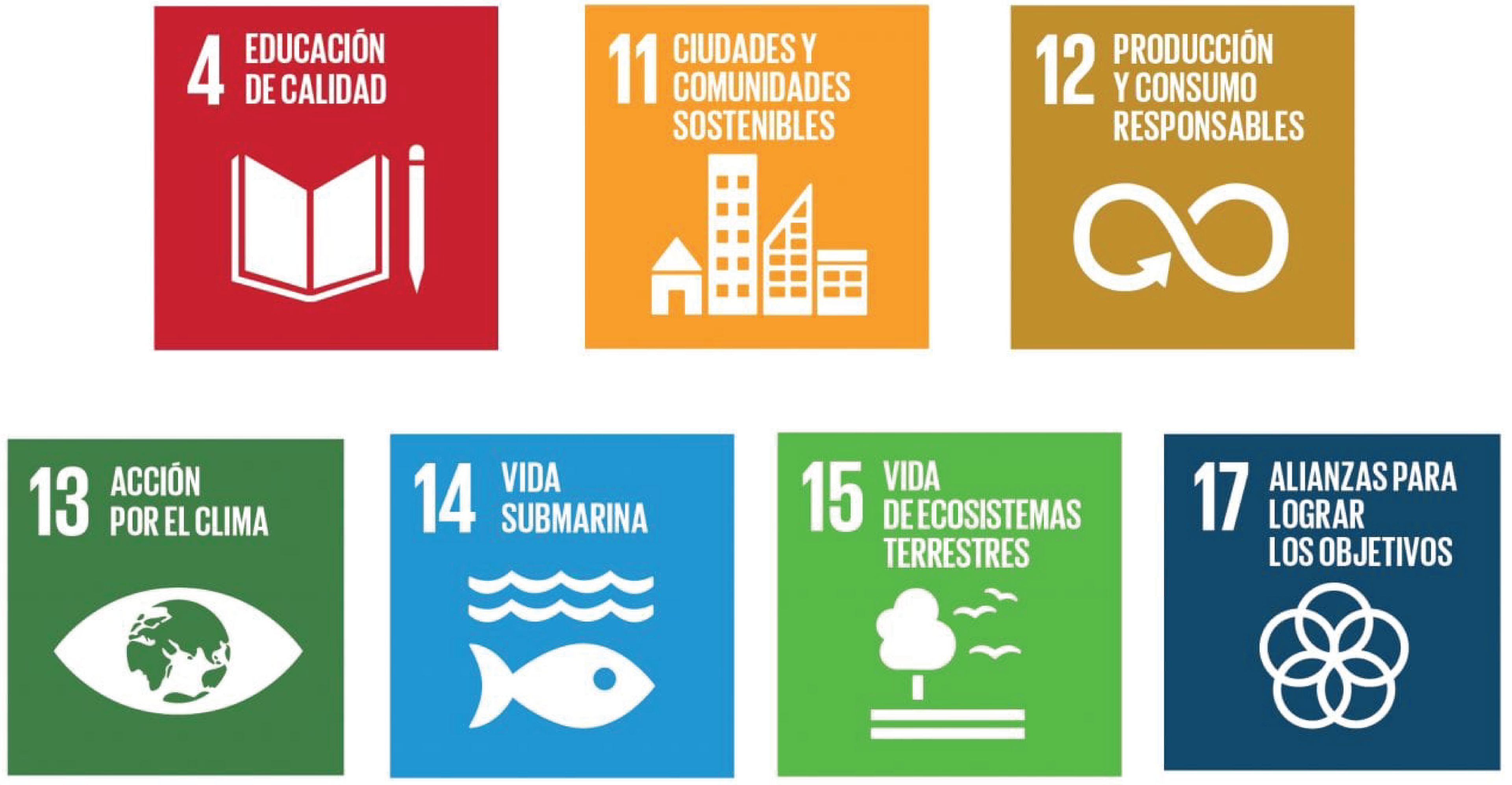 Educación de calidad, comunidades sostenibles, producción responsable, acción climática, protección de la vida marina, conservación de ecosistemas terrestres y construcción de alianzas transformadoras.
